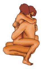 Si el hombre está dotado de flexibilidad y resistencia, ésta posición tiene una variante muy atractiva para los amantes del balanceo durante el coito. En cuclillas, el hombre recibe a la mujer preparado para quedar realmente extasiado, sus movimientos pueden imitar los de una hamaca, yendo de atrás para adelante con los pies bien apoyados en el piso. De otra manera, él puede quedarse inmóvil y dejar que ella se mueva hasta el final.