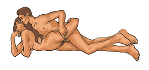 Ambos tendidos de costado, en un lugar cómodo y flexible como la cama. Ella de espaldas a él, en un alarde de destreza, la mujer pasa su pierna externa flexionada abriendo la puerta al placer, el hombre la penetra haciendo palanca con la pierna de ella que se apoya en la cadera de él. Los secretos que el hombre puede propiciarle a su compañera por la cercanía de su oreja son el condimento perfecto para alcanzar el máximo de placer. La penetración llega hasta la mitad del camino, por lo que el goce viene de la mano del deseo de que se haga profunda y estalle en el orgasmo más excitante.